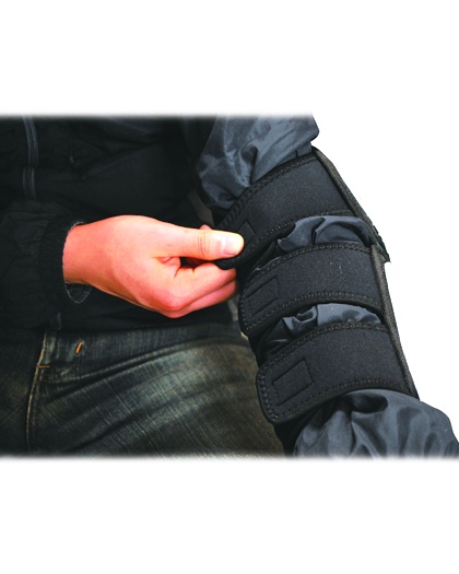 フラップベルトで着衣の上からでも簡単に装着できるエルボーガード。