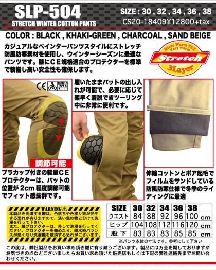 ペインターパンツスタイルでカジュアルに着こなせるストレッチコットンパンツに裏起毛を付け防寒性を高めました。TPUラミネートにより防風性に優れながらも柔らかく伸縮を損なわず長時間快適に使用できます。