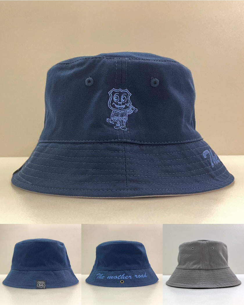ルート66オフィシャルキャラクターをさりげなく刺繍した、流行のバケツハット。リバーシブルなので1枚で2枚分のコーディネートが可能。カラビナを通せるハトメがあるので、ヘルメット着用時はベルトにひっかけておけるのが地味に便利なポイント。