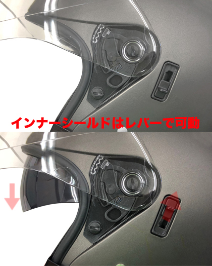 メインシールドを下げたままインナーシールドをレバーで操作可能で、日差しの変化によってワンタッチで操作できます。