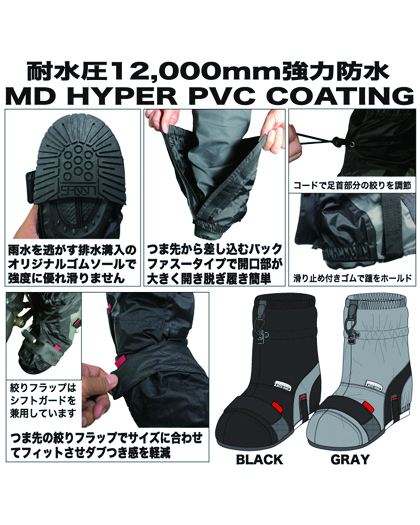 雨の侵入を防ぎながらも大きくなり過ぎないミドル丈のブーツカバーです。踵側が大きく開くので履きやすく急な雨でもスムーズに装着で着ます。滑りを防ぐゴムソール