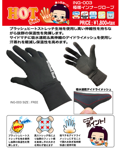 高い伸縮性と本性で快適に使用できるインナーグローブ。指マチには高伸縮メッシュを使用し蒸れを逃がして手汗による冷え感を軽減します。