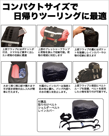 コンパクトサイズで日帰りツーリングに最適な容量のシートバッグ。べルトで簡単に取付でき、小さめのタンデムシートから大型のシートまで幅広い形状に対応します。上蓋部分にポケットとべルトを装備し小物の収納等に非常に活躍します。