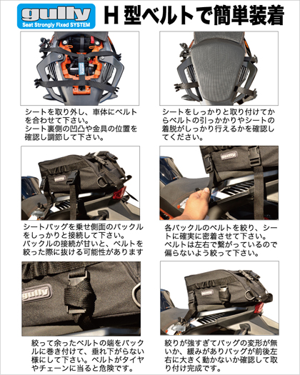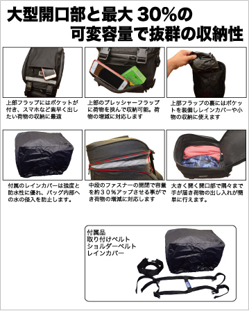レインウエアーやカメラ等のかさばりやすい荷物もしっかり収納できる大容量シートバッグ。上蓋やサイドに小物入れ用のポケットがあり分けて収納できるので非常に便利です。中段ファスナーを開くと容量アップができるので荷物の変化にも対応。